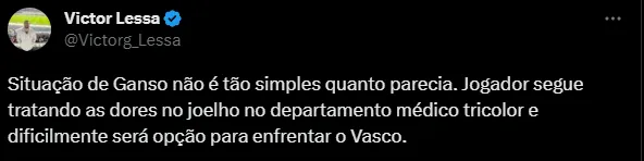 “O treino é hoje a tarde para o Diniz treinar o elenco. O Ganso virou de fato uma preocupação, como eu já desconfiava. Ele não foi a campo ontem (terça) novamente, ele ficou realizando tratamento e isso mostra que não foi uma simples pancada. O Ganso tem alguma coisa que está pegando. Não tenho informações mais claras sobre isso, mas como ele não foi a campo ontem, se ele não treinar hoje, é praticamente certo que não encara o Vasco. Dá para dizer que virou uma preocupação”, explicou o jornalista, em seu canal no YouTube.