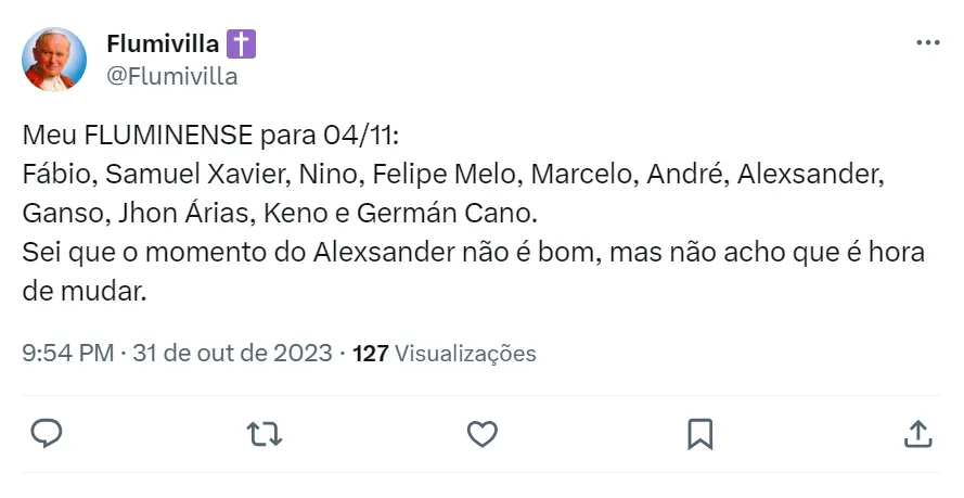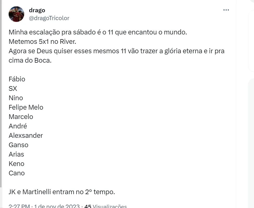 Com isso, o treinador Fernando Diniz pode ter a chance de escalar força máxima e mandar a campo o que tem de melhor para ir em busca do título inédito. Nino e Felipe Melo são titulares absolutos da equipe.