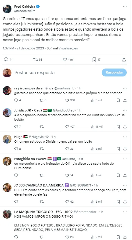 Pep Guardiola disse que se agrada muito com o estilo de jogo que é proposto pelo Flu. “Eu amo! Eu amo a construção, eu amo como eles trocam passes entre eles, o respeito e o tempo inteiro com a bola. eu conheço perfeitamente o time que nós vamos enfrentar”.