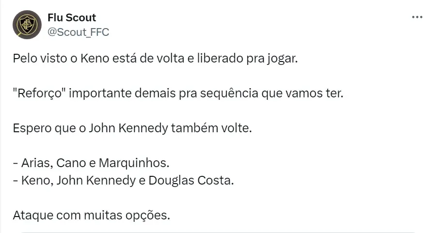Outra ausência é John Kennedy, que segue afastado do elenco por indisciplina. A diretoria do Tricolor deseja 7 milhões de euros para vender o atleta. Com desfalques, o Fluminense busca a vitória contra o Colo-Colo para seguir na liderança do Grupo A da Libertadores.
