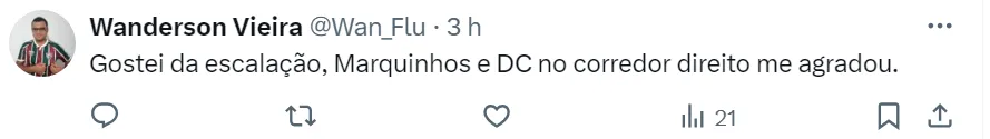 O lateral-direito Samuel Xavier tem uma fratura no pé direito e segue desfalcando o time de Fernando Diniz. Desta forma, o treinador do Fluzão opta por improvisar o atacante Marquinhos na defesa.