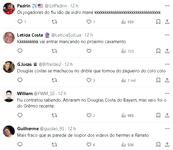 Após sair do campo durante o primeiro tempo da partida em que o Fluminense venceu o Colo-Colo por 1 a 0, no Chile, na última quinta-feira (9), Douglas Costa passou por uma avaliação inicial ainda em Santiago, onde a suspeita recai sobre uma lesão no músculo posterior da coxa direita.