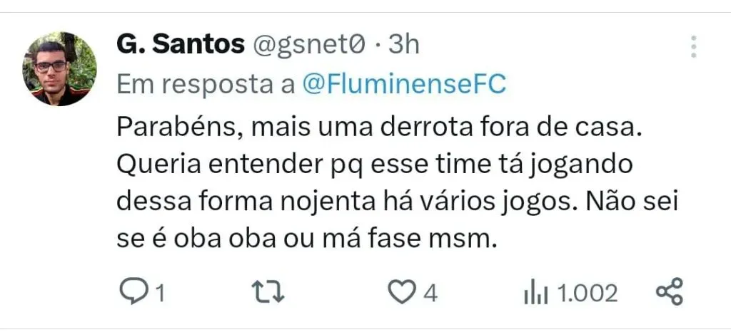 O Fluminense tropeçou mais uma vez no Campeonato Brasileiro. O Tricolor das Laranjeiras perdeu por 1 a 0 para o RB Bragantino e agora chega a sua quarta rodada sem vencer, sendo três reveses e um empate. Com a sequencia ruim a equipe se distanciou do G-4 e ocupa a nona colocação com 42 pontos, cinco a menos que o Palmeiras, primeira equipe dentro da zona que classifica para a fase de grupos da Libertadores.