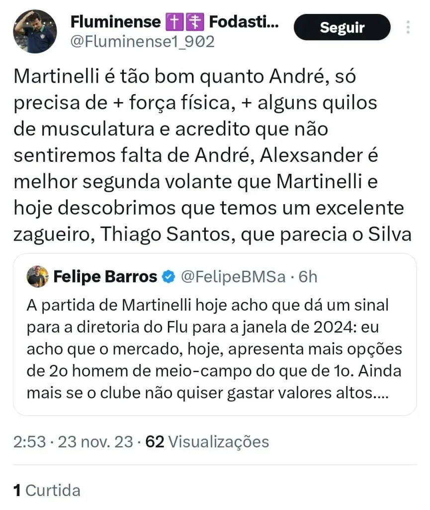 ‘’Eu gostei muito da participação dos dois (Martinelli e Alexsander). A saída do André é iminente e são dois jogadores formados no Fluminense que, tanto um quanto outro, já viveram momentos muito bons e voltaram a viver bons momentos aqui dentro do clube.”