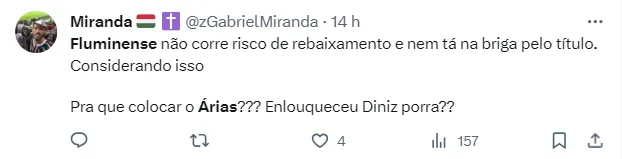 Torcida ficou revoltada com Diniz colocando Arias contra o Galo