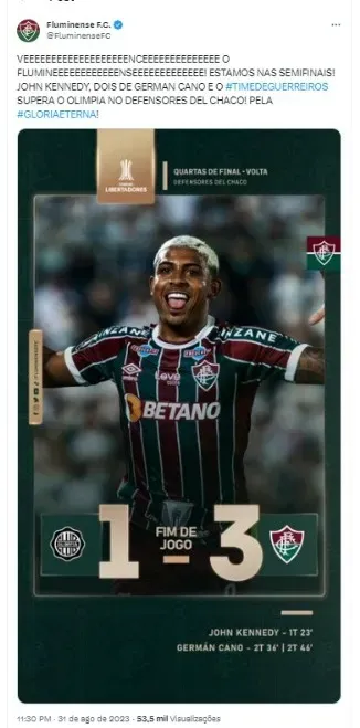 O Fluminense garantiu a classificação para a próxima fase da Copa Libertadores, com show de John Kennedy. O atacante abriu o placar no Defensores Del Chaco na vitória por 3 a 1 contra o Olimpia, e, depois Cano marcou os dois gols do confronto. No agregado, a equipe brasileira conquistou a vaga com o placar de 5 a 2.