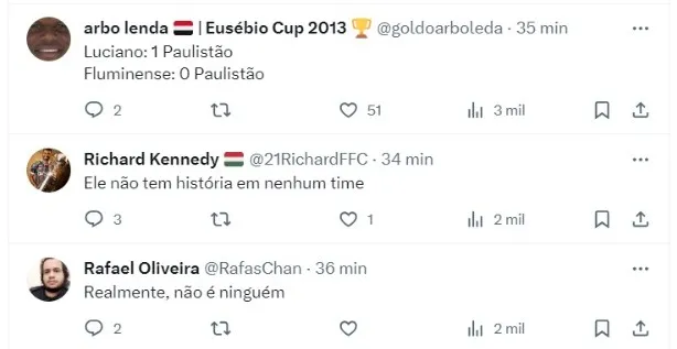 “Eu passei por aqui, eu não fiz história no Fluminense, por isso que eu tô sendo xingado”, Luciano, na saída do primeiro tempo de Fluminense x São Paulo, antes de pedir expulsão de Cano: