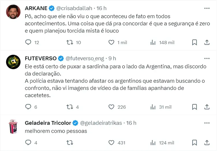 “Essa equipe segue fazendo história. Grande vitória no Maracanã, ainda que fique marcada pela repressão aos argentinos mais uma vez no Brasil. Isso não se pode tolerar, é uma loucura que tem que terminar já!”, finalizou.