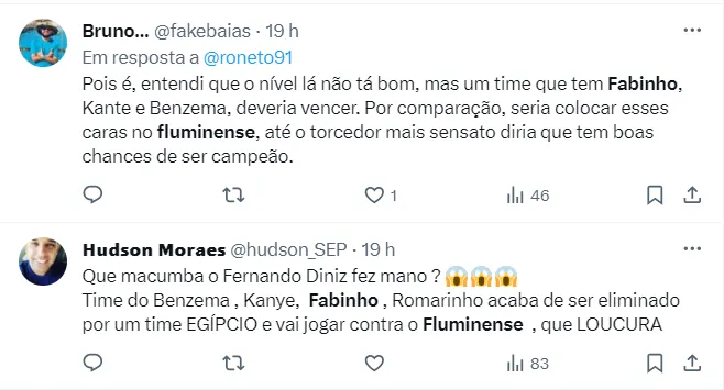Após a eliminação contra o Al Ahly, Fabinho concedeu entrevista: “A expectativa era chegar na semifinal, independente de ser contra o Fluminense… Por jogar em casa, investimento que foi feito, expectativa da torcida. Infelizmente, não chegamos, mas o time do Al Ahly é bom, coloca muita intensidade no jogo, fecha os espaços, e tem jogadores experientes”.