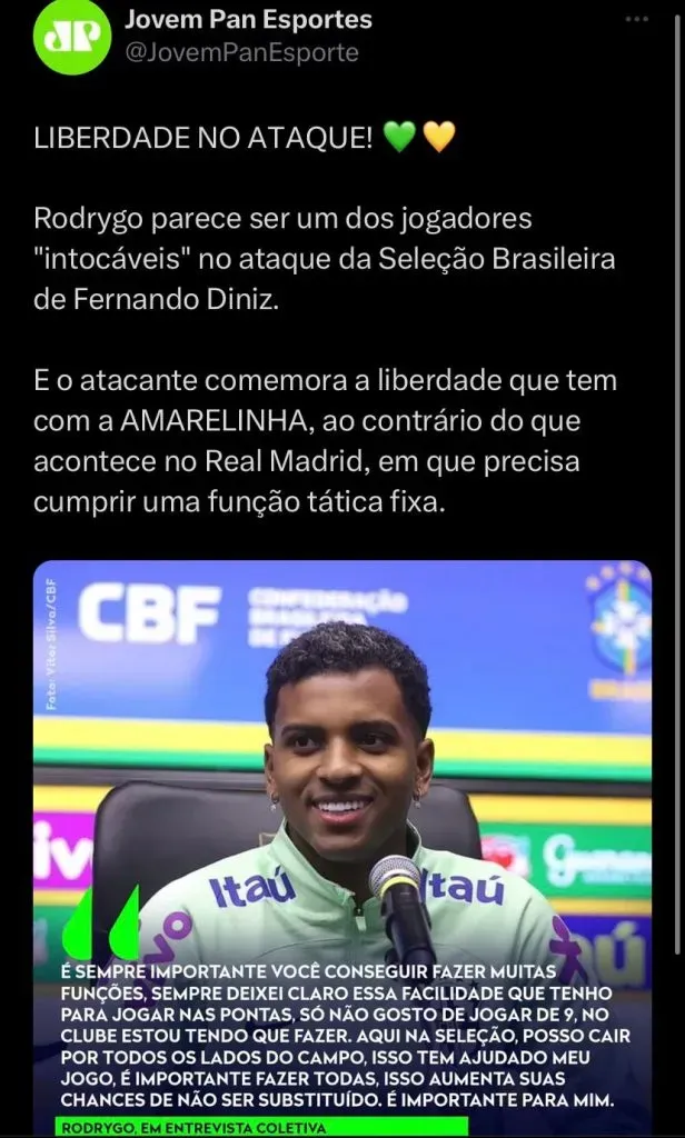 Em entrevista coletiva, o atacante Rodrygo comentou sobre a admiração que sente por Fernando Diniz. “Muito feliz por estar fazendo parte desse novo ciclo, minha família toda é fã do Diniz, ele trabalhou em Osasco, todo mundo acompanhou ele, faz parte história da minha família”, disse ele, que completou: