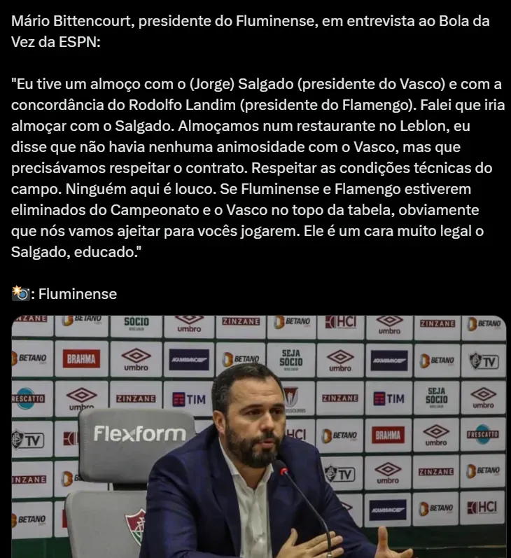 Desse modo, Jorge Salgado começou a missão de achar algum lugar para mandar suas partidas. Agora, o presidente do Fluminense, Mário Bittencourt contou no programa Bola da Vez, que teve uma reunião com o presidente do Gigante da Colina sobre o uso do Maracanã pelo time rival. Além disso,contou com o aval do mandatário do Flamengo, Rodrigo Landim, na sua decisão.
