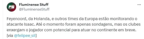 Até agora, os interesses não passaram de sondagens. Isaac já foi aproveitado em nove partidas do time principal do Fluminense neste ano. Fez parte do elenco campeão carioca e ainda jogou no Brasileiro e Libertadores. O atleta é encarado como uma das principais joias do futebol nacional.