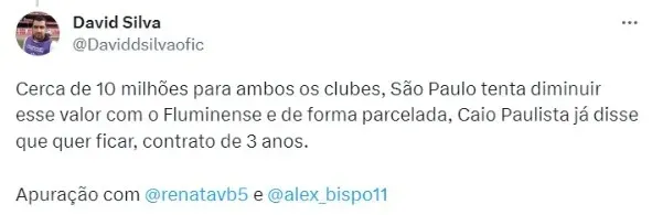 David afirmou que com clube mineiro está tudo certo, falta acertar alguns detalhes com o Fluminense. Cerca de 10 milhões para ambos os clubes, com o São Paulo tentando diminuir esse valor com o Fluminense e de forma parcelada, Caio Paulista já disse que quer ficar, em outras oportunidades.