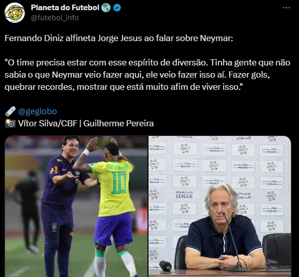 Neymar vive a expectativa de estrear pelo Al-Hilal, o que deve acontecer depois da Data Fifa. Enquanto isso, o craque segue com a Seleção Brasileira sendo treinado por Fernando Diniz, justamente o técnico do Fluminense. Eles estão concentrados para o jogo contra o Peru, na terça-feira (12), às 23h, contra o Peru, fora de casa, pelas Eliminatórias da Copa de 2026.