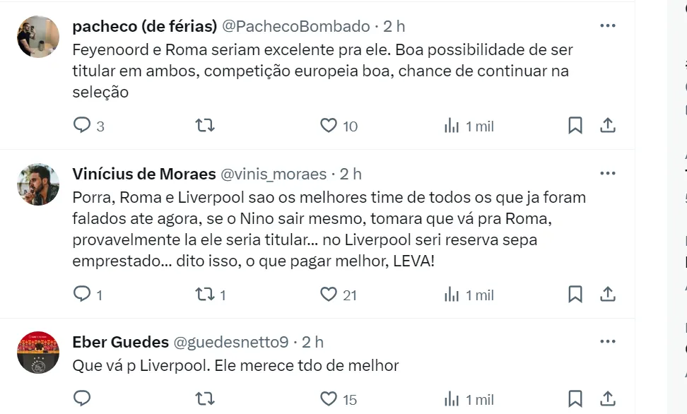 Além desses dois clubes, o repórter declarou que Fulham e Liverpool, ambos da Inglaterra, também pediram informações nas últimas horas sobre o zagueiro Nino, que deve deixar o Fluminense para a Europa.