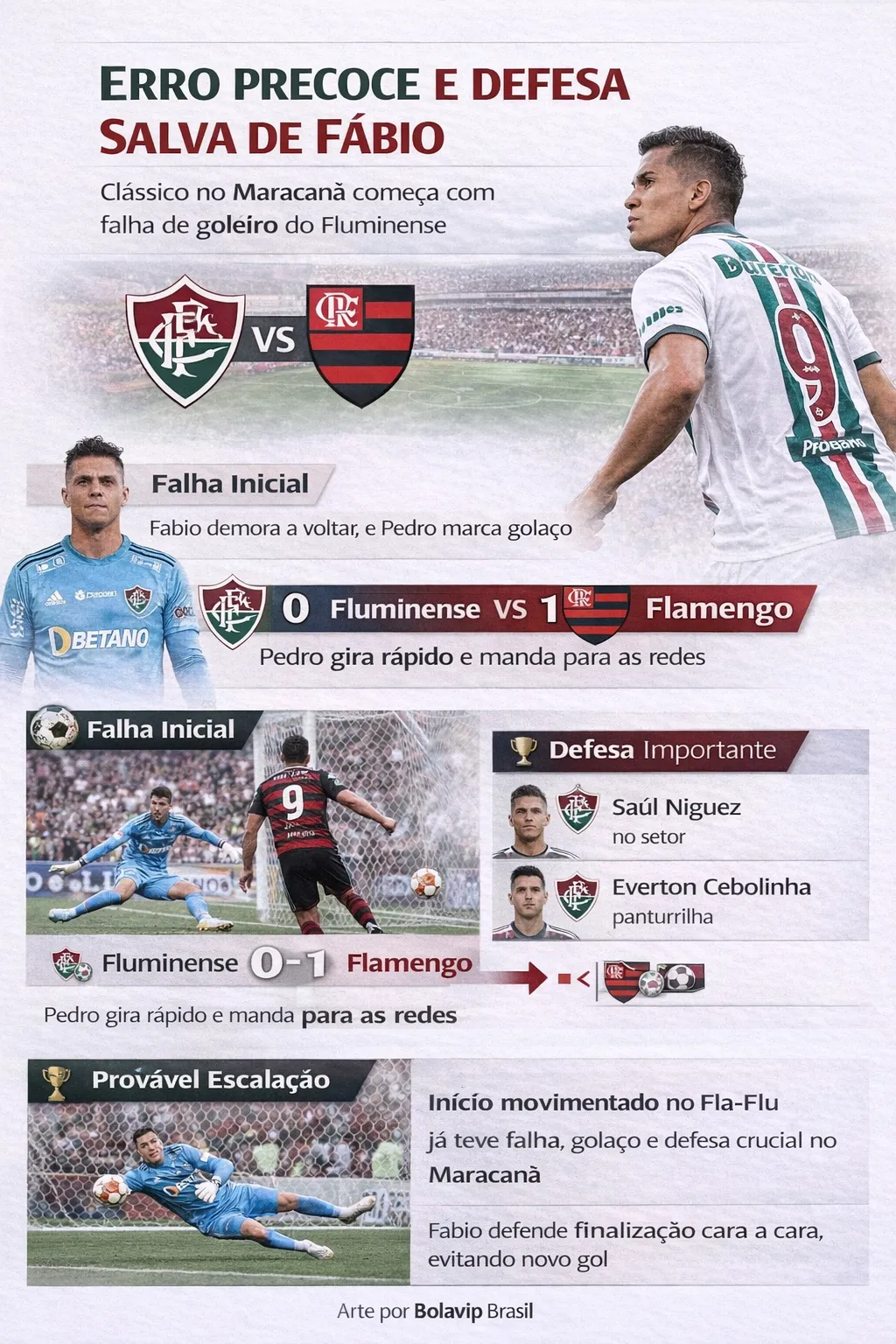 O clássico entre Fluminense e Flamengo, no Estádio do Maracanã, começou movimentado e com lance decisivo logo nos primeiros minutos. O goleiro Fábio demorou a retornar ao gol e acabou sendo surpreendido por Pedro, gerando críticas imediatas da torcida tricolor.