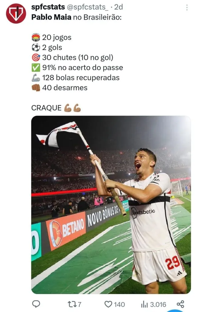 Pablo Maia é uma das crias da Cotia que conquistou o coração do torcedor do São Paulo. O volante de 21 anos está na sua segunda temporada pela equipe profissional do Tricolor e soma 108 partidas, sendo titular em 83 delas, com cinco gols marcados e três assistências até aqui.