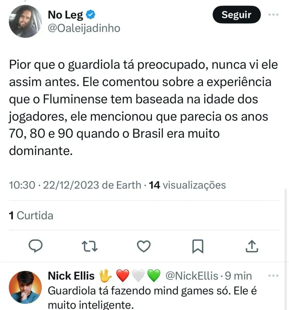 E quem falou sobre o time de Fernando Diniz foi Pep Guardiola. O espanhol destacou o técnico Fernando Diniz. O Tricolor, chegou a afirmar que o City nunca enfrentou um time que joga da maneira como o Flu do técnico Tricolor das Laranjeiras
