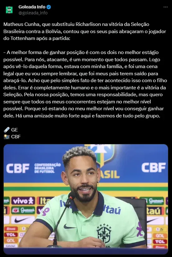 Matheus Cunha compartilhou que as palavras de Diniz são extremamente impactantes e que gostaria que muitos jogadores de futebol pudessem ouvi-las. O atleta enfatizou como, apesar de estarem no topo de suas carreiras esportivas, todos são pessoas comuns, com suas próprias dúvidas e preocupações. Ter um treinador que os guia com compreensão e empatia é algo inspirador e motivador para todo o time.