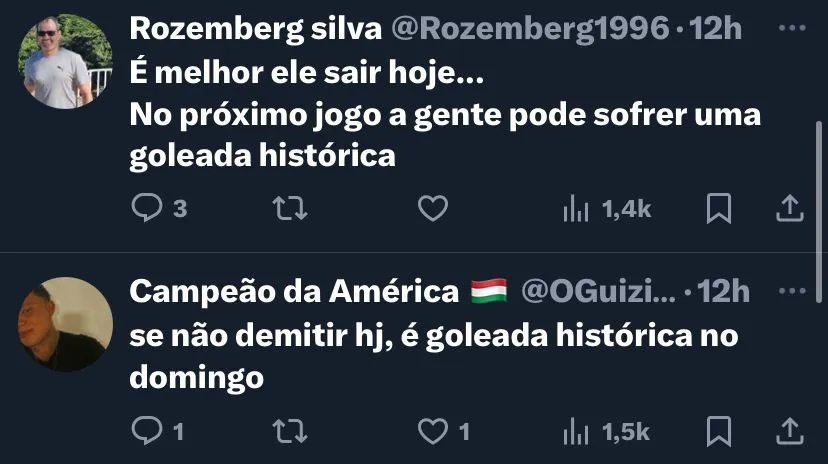 O treinador também comentou de uma possível demissão, muito pedida pelos torcedores, que colocaram uma faixa pedindo a sua saída: “Não é algo que eu gosto, mas também não me preocupa. Sei acolher com respeito a opinião do torcedor.”