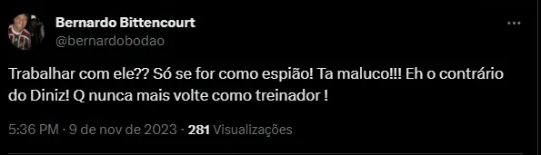 “Mandou mensagem ontem (8) para dizer que está à disposição para passar informações dos adversários. É um baita amigo que eu fiz, resenha, um grande treinador de futebol”, disse Bittencourt, ao Charla Podcast.