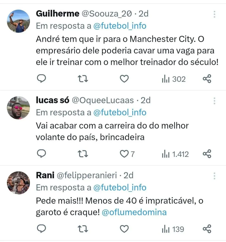 “O André é um jogador que tem mais condição de brilhar rápido na Europa. Vai voltar para encerrar a carreira. Vou sentir muita falta dele. Ele é um jogador extremamente raro no futebol, será quase impossível ele permanecer. Vamos torcer para ir para o melhor destino”, disse.