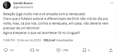 “Seleção joga muito mal e só empata com a Venezuela! Claro que o futebol autoral e diferenciado de Diniz não virá do dia para noite, mas, cá pra nós, contra a Venezuela, em casa, não deveria nem precisar de um técnico!!Agora é esperar o que vai acontecer lá no Uruguai!”, postou Galvão Bueno em sua conta no Twitter. Com o trabalho que faz no YouTube, o narrador busca ampliar a atuação em outras plataformas da internet.