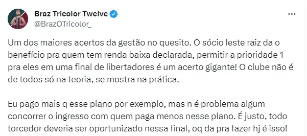 Para a final da Libertadores, os sócios pertencentes ao plano popular Leste Raiz poderão comprar os ingressos com prioridade junto aos planos mais caros, ou seja, assim que a venda for aberta o sócio do Leste Raiz tem o direito de realizar a compra . O torcedor do plano Leste Raiz, que paga mensalmente R$ 35, terá prioridade 1 para adquirir o bilhete. O presidente Mário Bittencourt falou como surgiu a ideia e quem foram as referências do Flu para que a estratégia se consolidasse. Confira após a enquete.