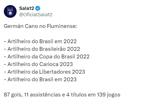 Na terça-feira (9), Cano marcou o gol da vitória do Fluminense, por 2 a 1. O Tricolor venceu o Colo-Colo, em jogo válido pela segunda rodada da fase de grupos da Copa Libertadores.