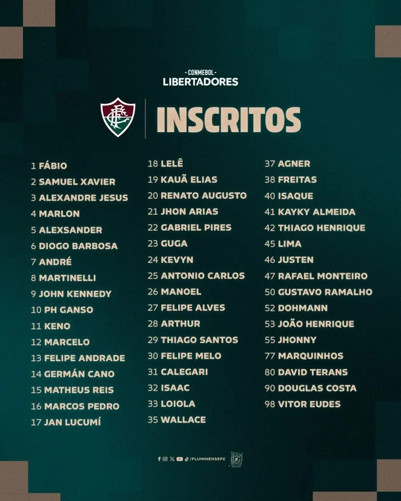 Atacantes: John Kennedy, Keno, Germán Cano, Matheus Reis, Jan Lucumí, Lelê, Kauã Elias, Isaac, Agner, Marquinhos e Douglas Costa. Os adversários do Flu na primeira fase, além do Alianza Lima, são Cerro Porteño, do Paraguai, e Colo-Colo, do Chile.