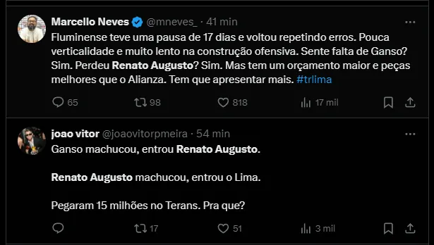 Para substituir o experiente meio-campista, o treinador optou por Lima e não Terans, que joga na mesma posição. Pouco utilizado por Diniz, o uruguaio custou cerca de R$ 14,4 milhões.
