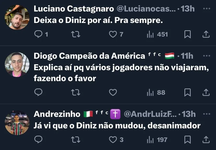 Fernando Diniz está recebendo muitas críticas da torcida tricolor, devido às atuações ruins do time. Apesar disso, o treinador ganha apoio e o elenco se mobiliza contra sua demissão no Fluminense.