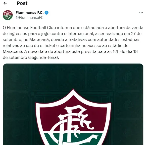 O Fluminense irá enfrentar o Internacional, em dois jogos da semifinal da Copa Libertadores. A primeira partida acontece no dia 27 se setembro, às 21h30 (horário de Brasília), no Maracanã. E o time carioca se pronunciou sobre as vendas para esse duelo.
