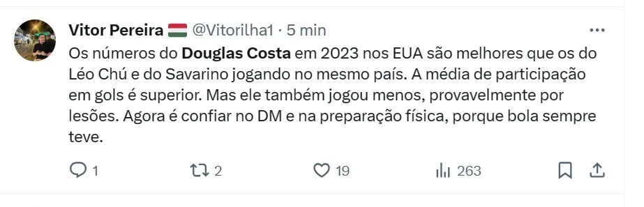 Com passagens por Shakhtar Donetsk, Bayern de Munique e Juventus, além do próprio Grêmio, Douglas Costa deixou o LA Galaxy, da MLS, no final de 2023 e se recusou a ir para a Turquia em troca de nova volta ao Brasil.