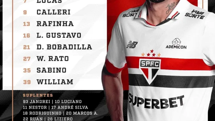 Rafael; Rafinha, Arboleda, Sabino e Welington; Bobadilla, Luiz Gustavo, Rato; Wilian, Lucas Moura e Calleri