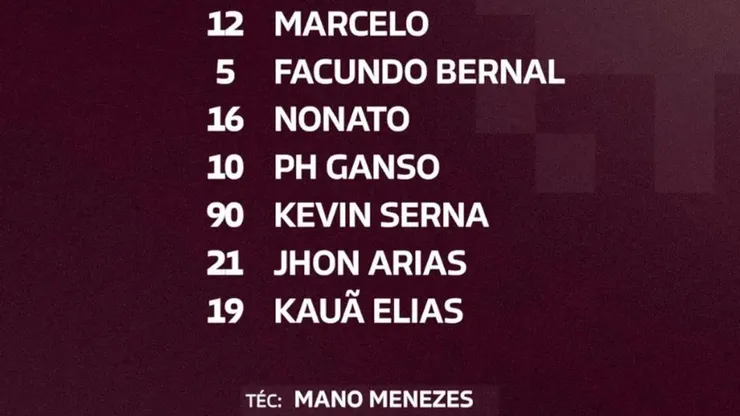 Fábio; Samuel Xavier, Thiago Silva, Thiago Santos e Marcelo; Facundo Bernal, Nonato e PH Ganso; Kevin Serna, Kauã Elias e Jhon Arias.
