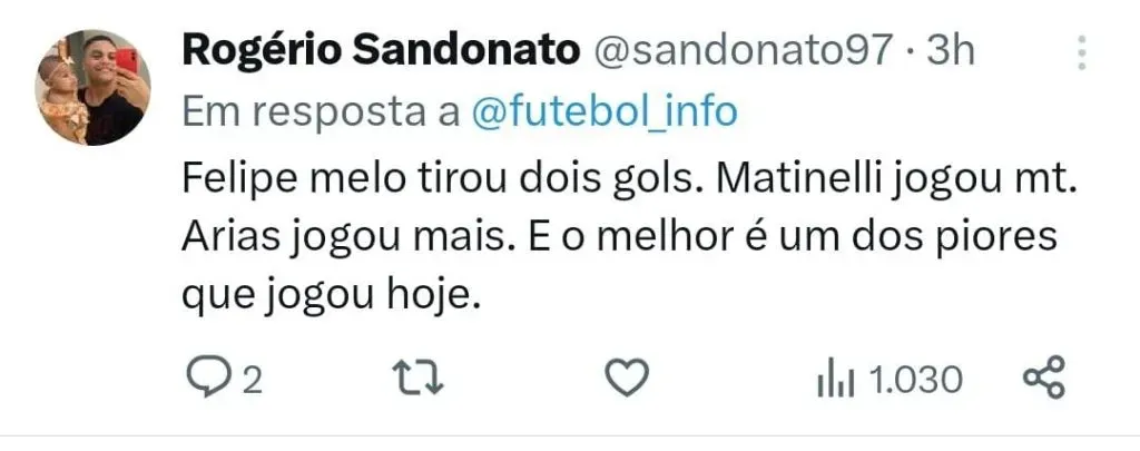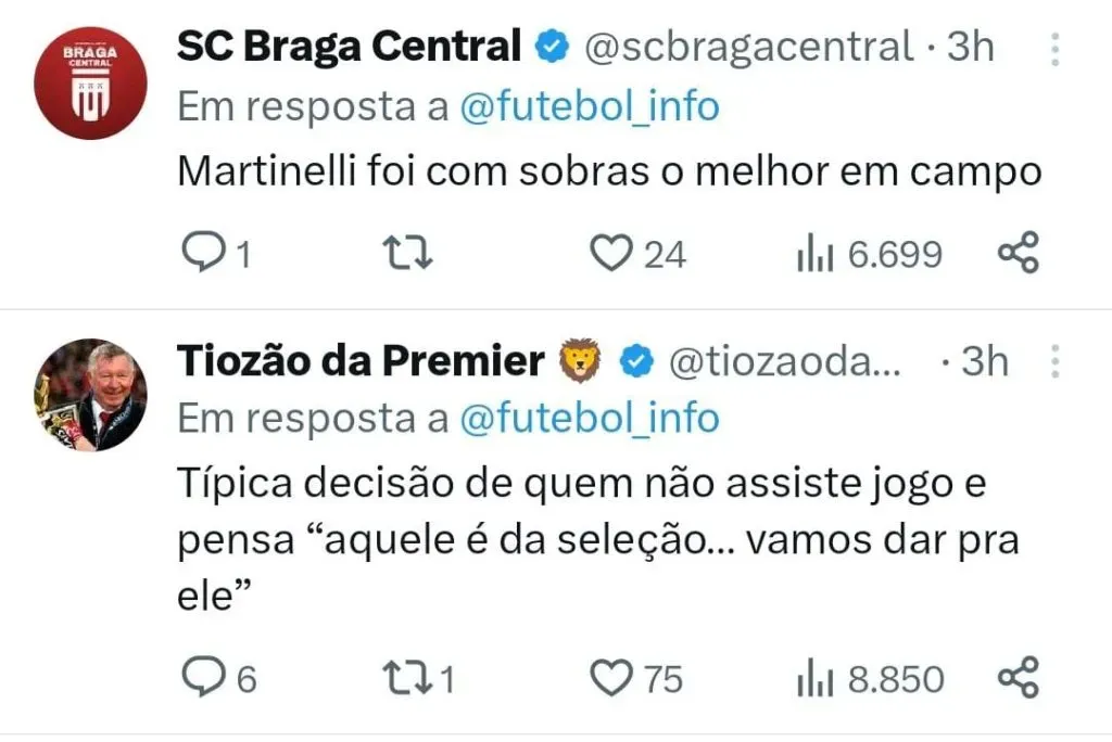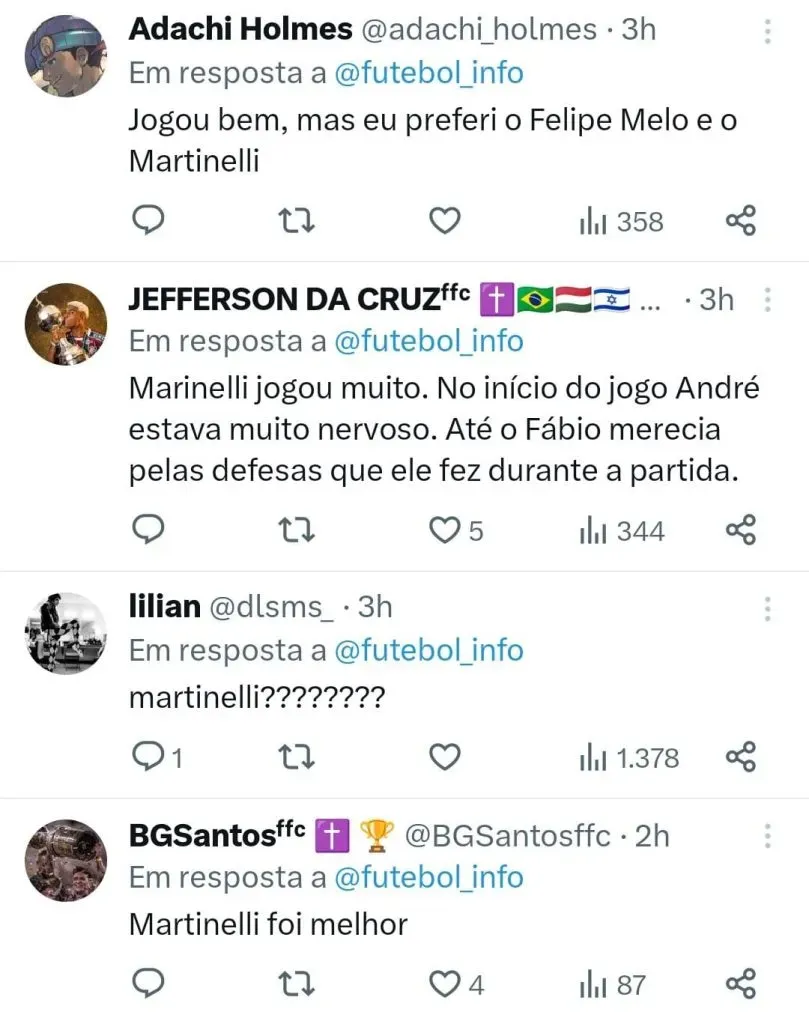 “Ele é craque. Até quando vai abaixo vai bem. Mas o melhor em campo hoje foi o Martinelli.”, escreveu outro. “O póbi do Martinelli foi assaltado, mas pelo menos o André valoriza mais um pouquinho 🤑 kkkkkkk”, concordou outro internauta.