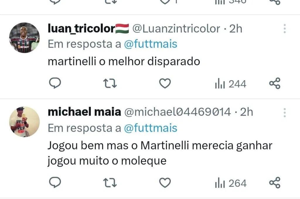 “Martinelli fez uma das melhores atuações de um jogador do Fluminense esse ano, deu um show”, escreveu um torcedor em um comentário no ‘X’.