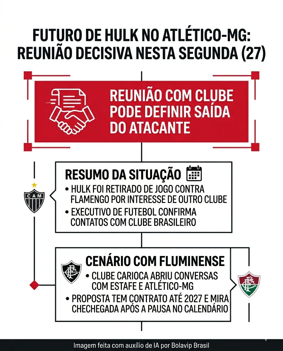 Hulk e Atlético têm reunião nesta segunda-feira (27) para discutir o futuro do atacante. Segundo os jornalistas Jéssica Maldonado e Marcello Neves, o encontro é tratado como decisivo e pode abrir caminho para uma possível saída, cenário acompanhado de perto pelo Fluminense.
