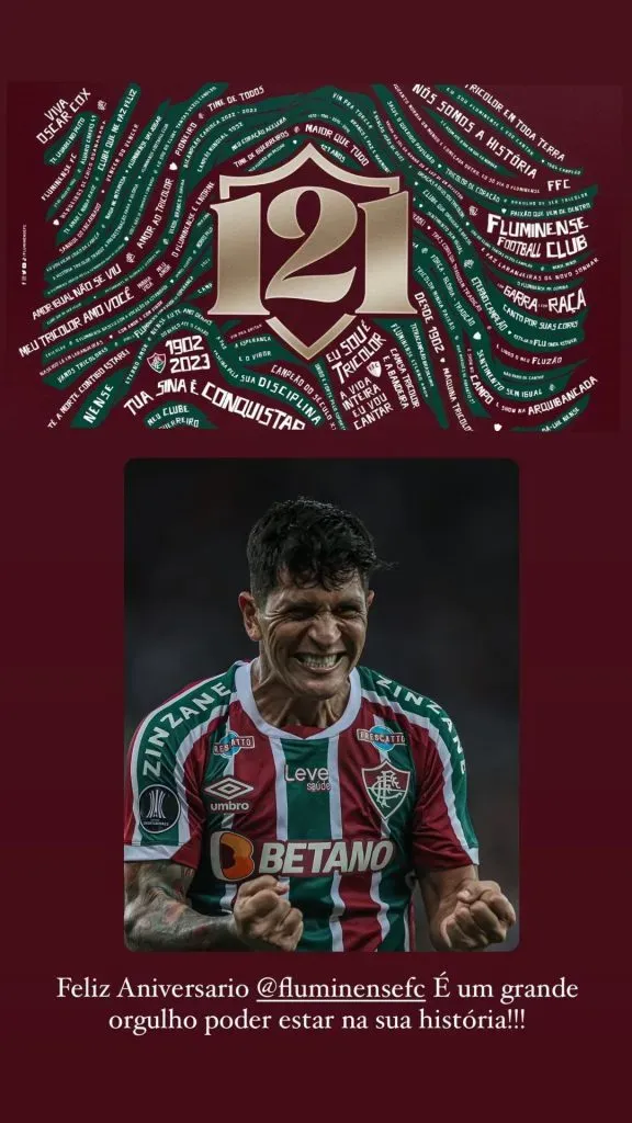 O maior artilheiro da história do clube, Fred, publicou uma mesagem também nas redes sociais parabenizando o Tricolor das Laranjeiras. “Grandes são os outros, o Fluminense é ENORME!” Parabéns pelos 121 anos de tradição, honra e glórias, FLUZÃO. Ter vestido essa camisa e ainda fazer parte dessa história gigante mesmo fora de campo é um privilégio, uma honra. Obrigado por tudo! Que venham mais conquistas e alegria pra nós”.