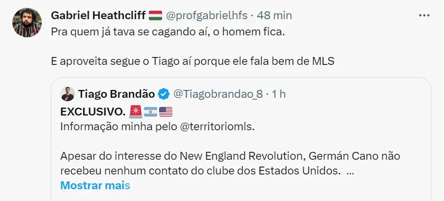 Apesar do interesse do New England Revolution, da Major League Soccer, o atacante Germán Cano não recebeu nenhum contato oficial da equipe do exterior, o que pode tranquilizar o Fluzão.