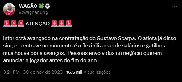 Ainda segundo o repórter, as pessoas envolvidas no negócio querem anunciar Gustavo Scarpa antes do fim do ano para ele já iniciar a pré-temporada com o elenco do Internacional.