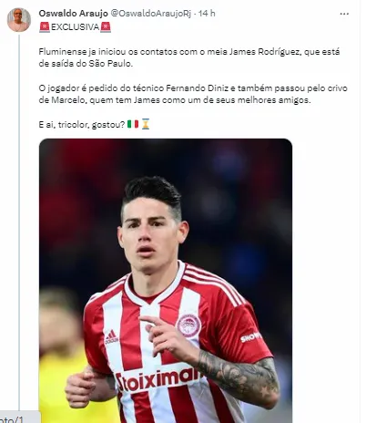 “Fluminense já iniciou os contatos com o meia James Rodríguez, que está de saída do São Paulo. O jogador é pedido do técnico Fernando Diniz e também passou pelo crivo de Marcelo, quem tem James como um de seus melhores amigos”, informou o comunicador.