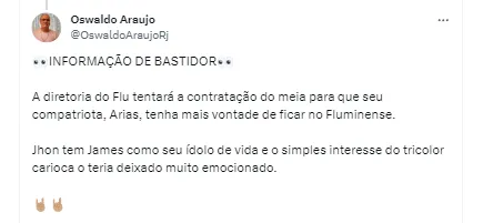 “A diretoria do Flu tentará a contratação do meia para que seu compatriota, Arias, tenha mais vontade de ficar no Fluminense”, continuou o jornalista, antes de completar:
