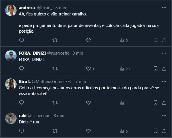 “Eu não ligo (para vaias). Não escutei na Libertadores. Eu fico focado no que eu faço. Diniz fala para ficarmos concentrados, darmos o máximo e dou o melhor (pelo Fluminense). Fico feliz pelos gols, mas triste pelo empate”, declarou.