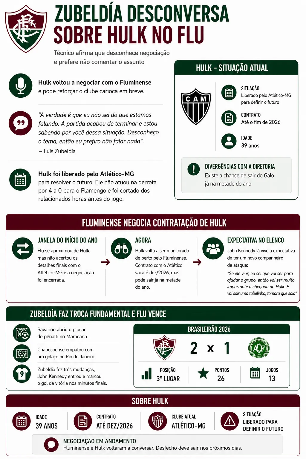 Agora, Hulk volta novamente a ser monitorado de perto pelo Flu, segundo informações inicias do ge. Ele tem contrato com o Atlético até o fim de 2026, porém existe a chance de sair já na metade do ano por conta de divergências com a alta cúpula do clube mineiro.