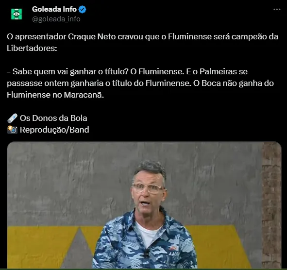 Nesta sexta-feira (6), o apresentador do programa Os Donos da Bola e ex-jogador, Neto, cravou quem será o campeão da Libertadores. Em uma análise sobre a eliminação do Palmeiras, segundo o comunicador, o Fluminense ficará com a taça inédita, vencendo o Boca na decisão que será disputada no Maracanã, casa do Flu.