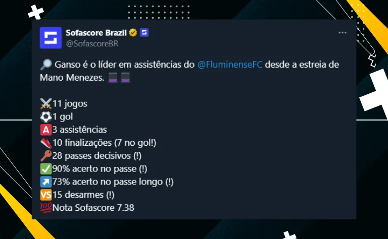 Além dos números já mencionados acima, outras estatísticas vêm chamando atenção no jogo do meia. Ao todo, são dez finalizações, 28 passes decisivos e 90% acerto no passe, de acordo com o SofaScore.