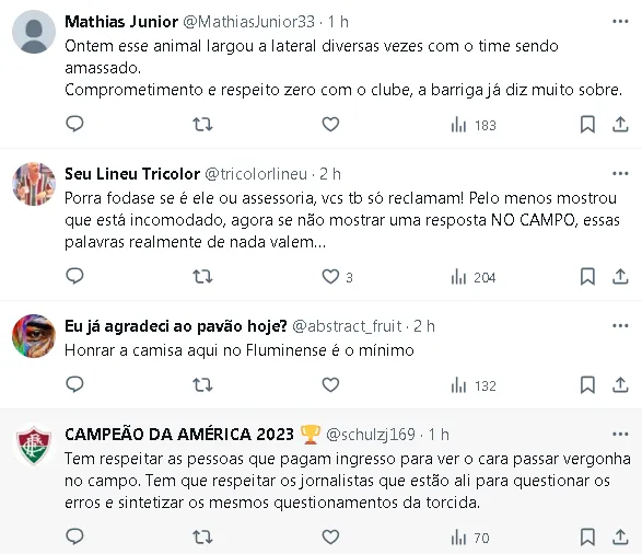 ”Mas temos que honrar essa camisa. Sabemos do que o Fluminense é capaz“, completou o jogador, demonstrando seu comprometimento com a equipe.