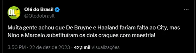 “Muita gente achou que De Bruyne e Haaland fariam falta ao City, mas Nino e Marcelo substituíram os dois craques com maestria“, foi um dos comentários feitos durante a decisão do Mundial de Clubes de 2023.